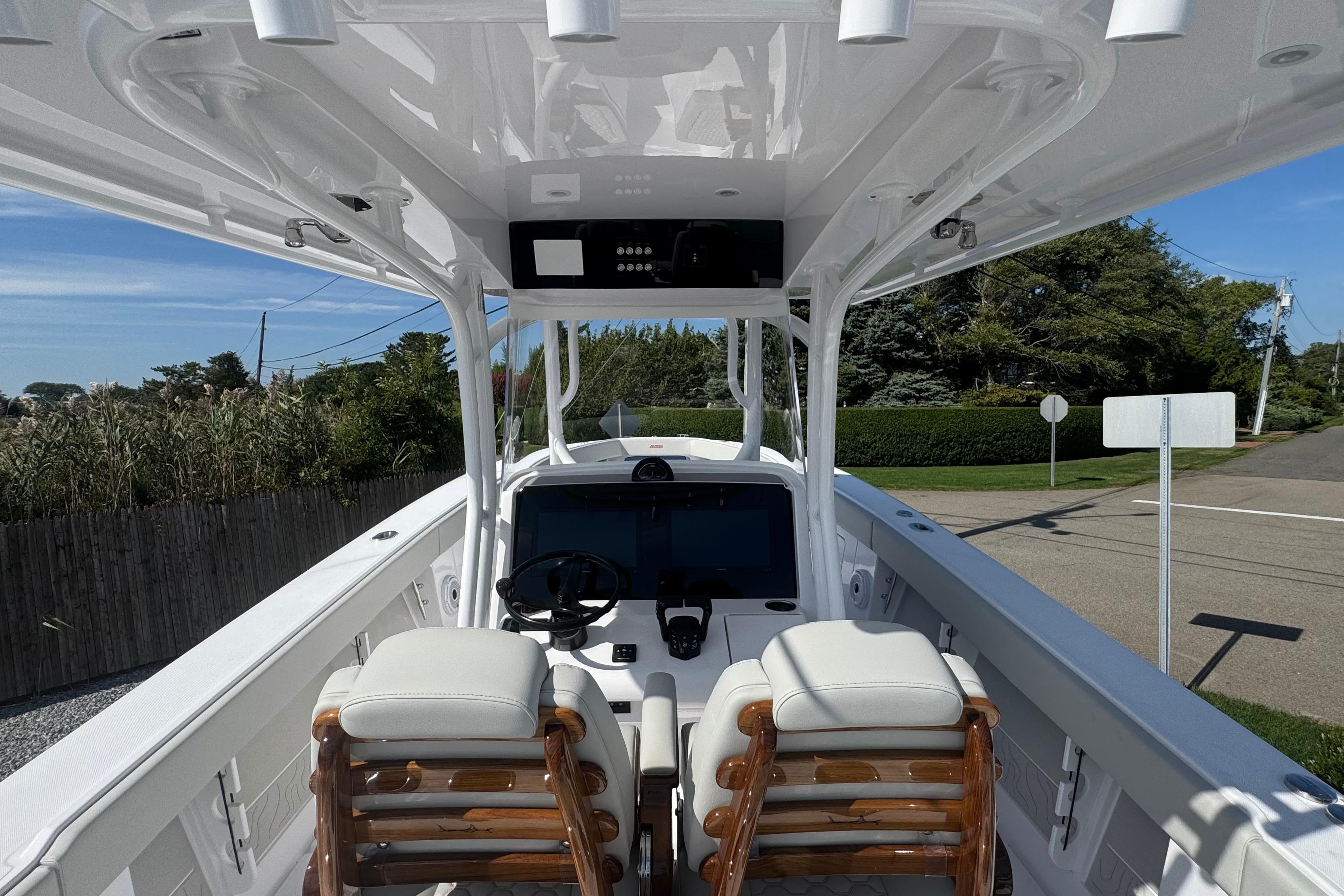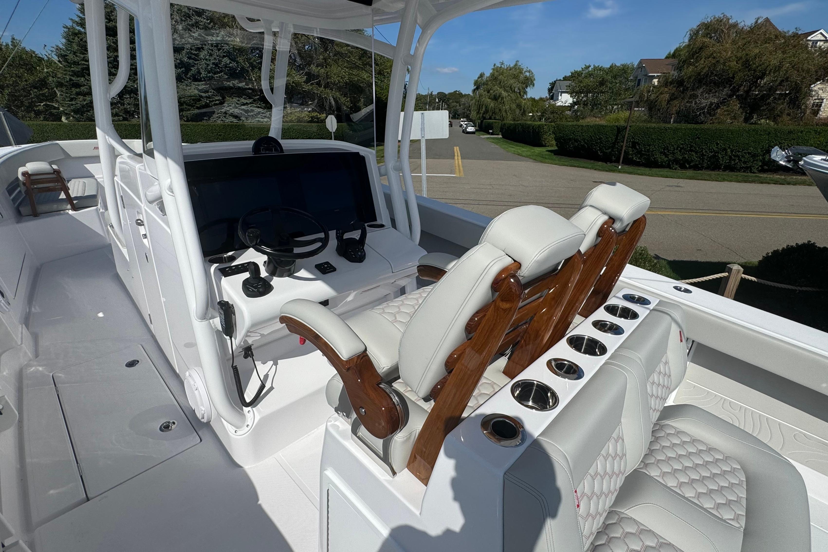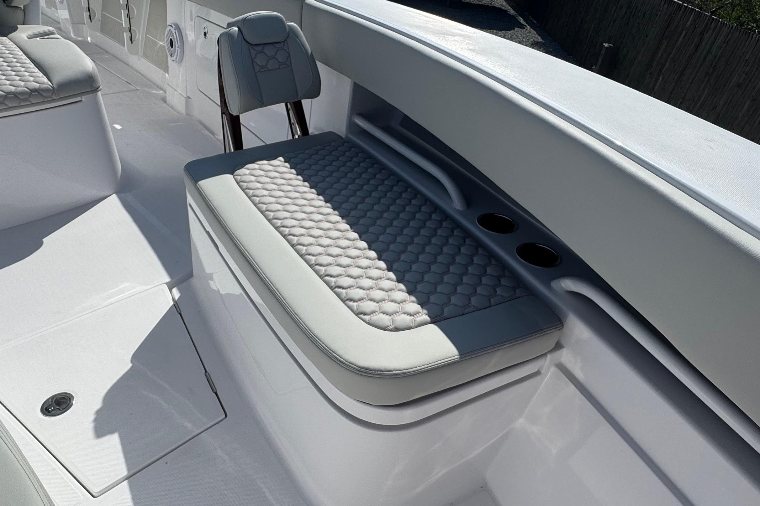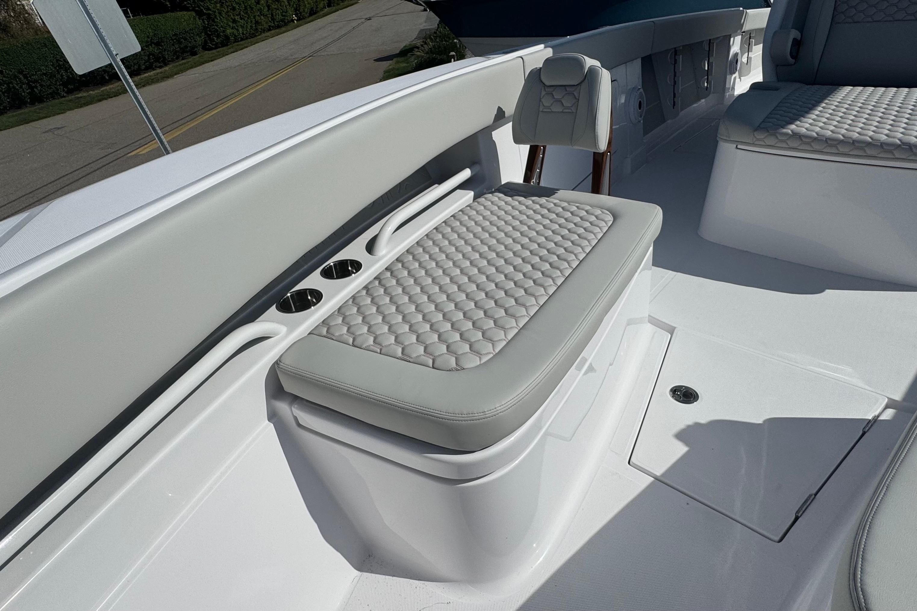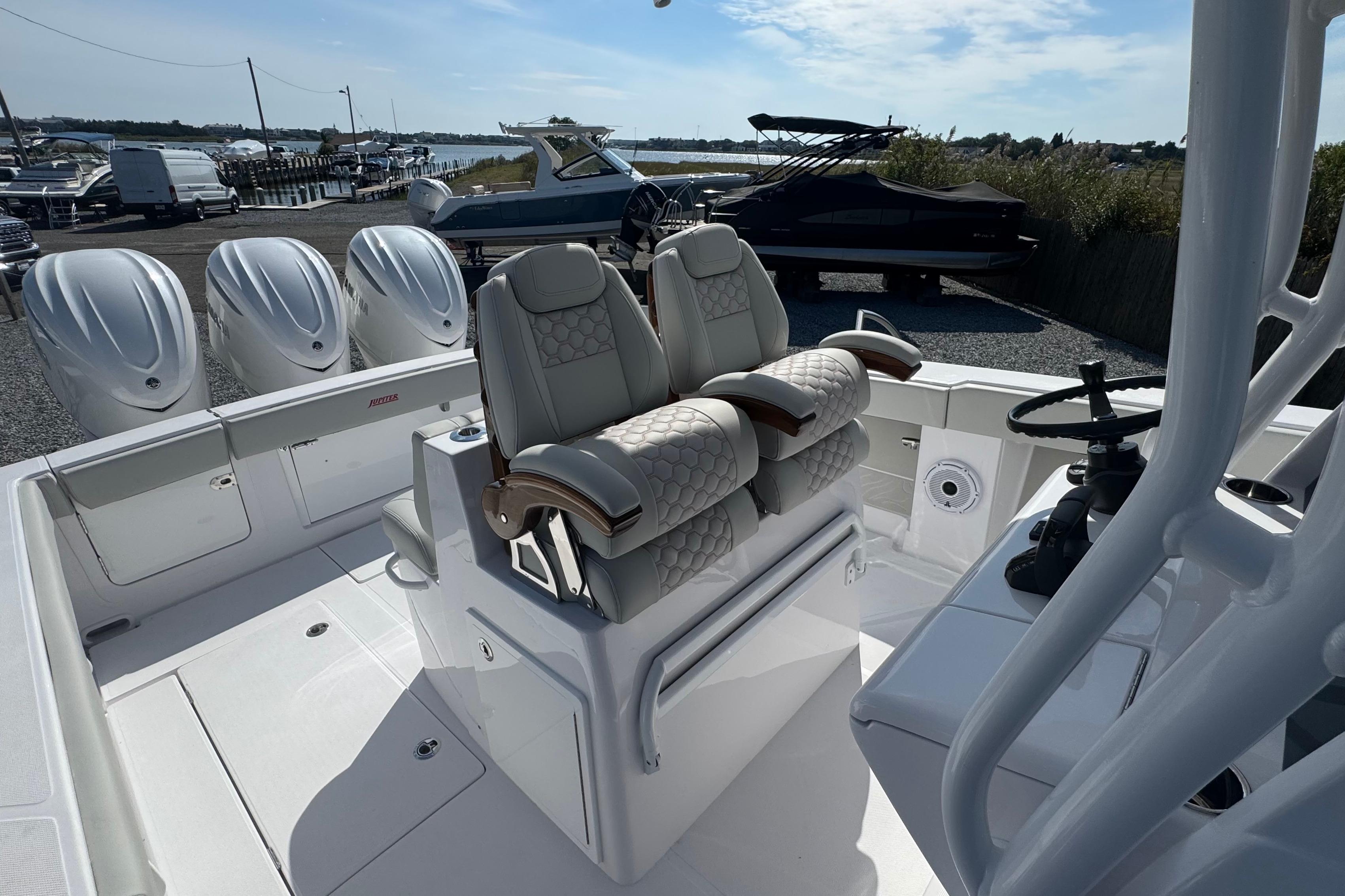 This build is powered by triple Yamaha F350s with Helm Master joystick control and autopilot, offering unmatched maneuverability and precise handling. Finished in classic white gelcoat with a red/marine gray boot stripe, this 34 HFS is outfitted with premium fishing, seating, and technology options designed for serious anglers and discerning owners.