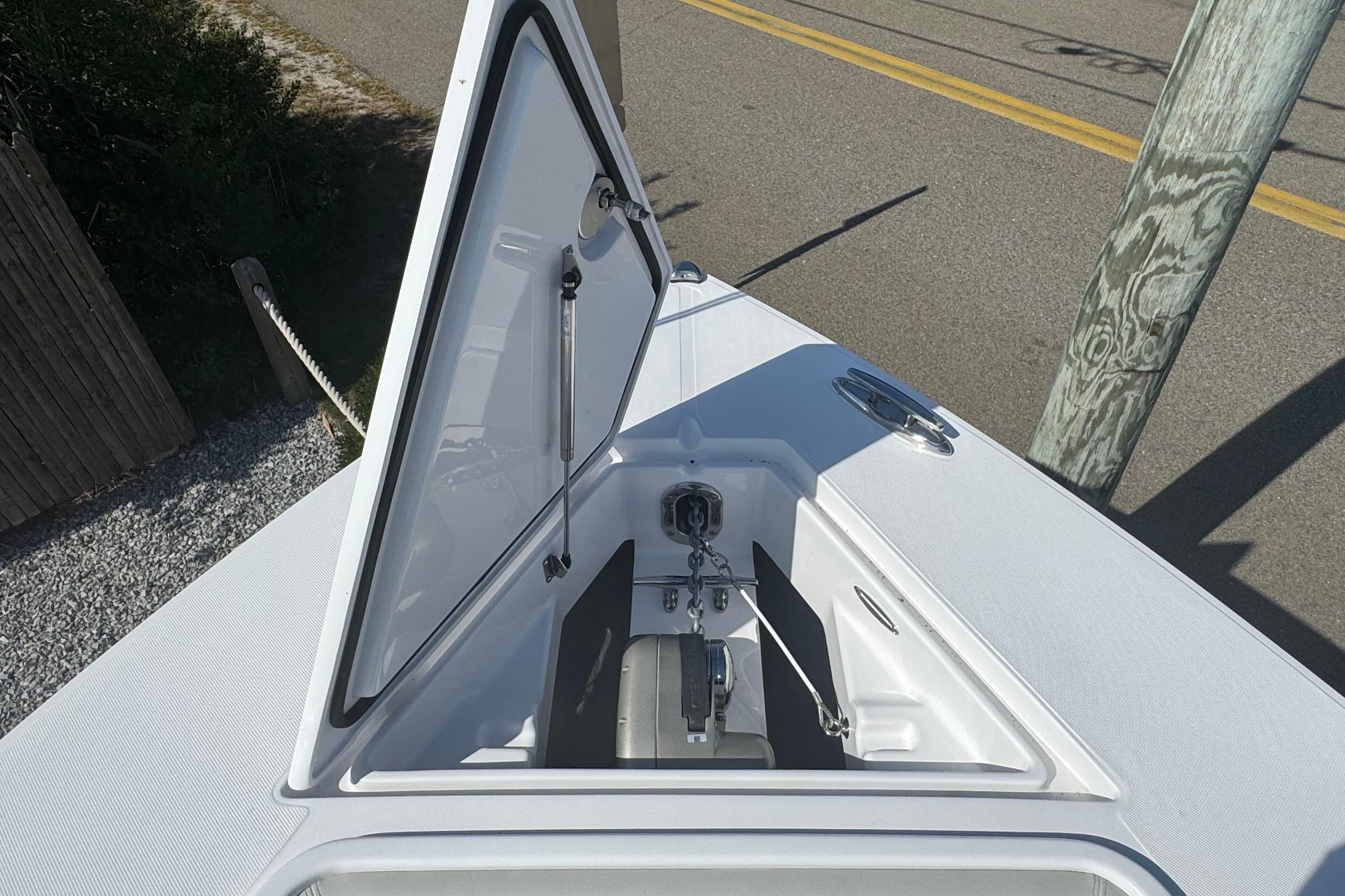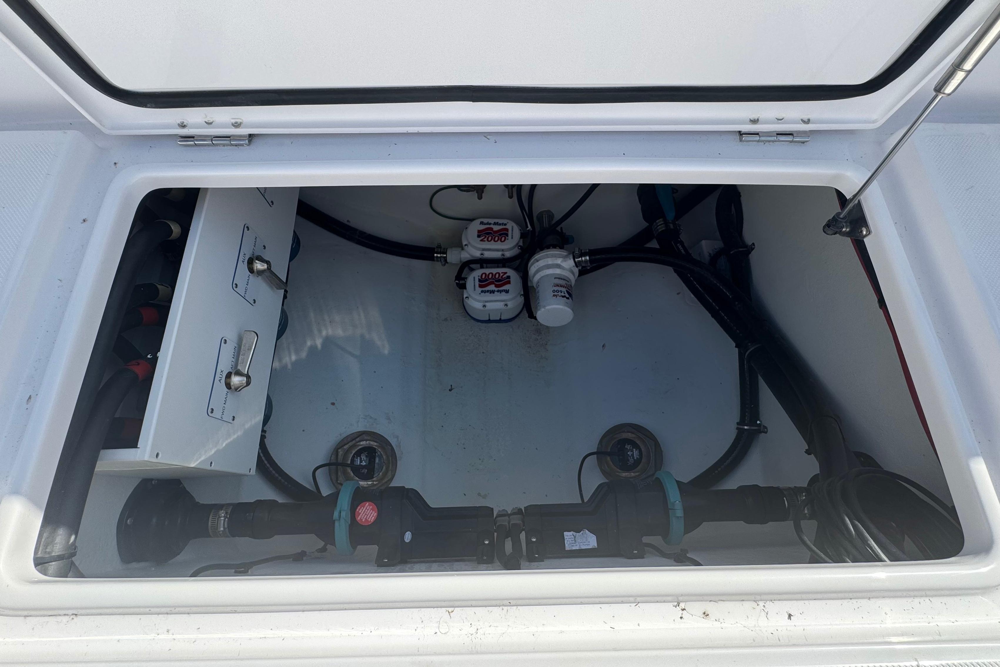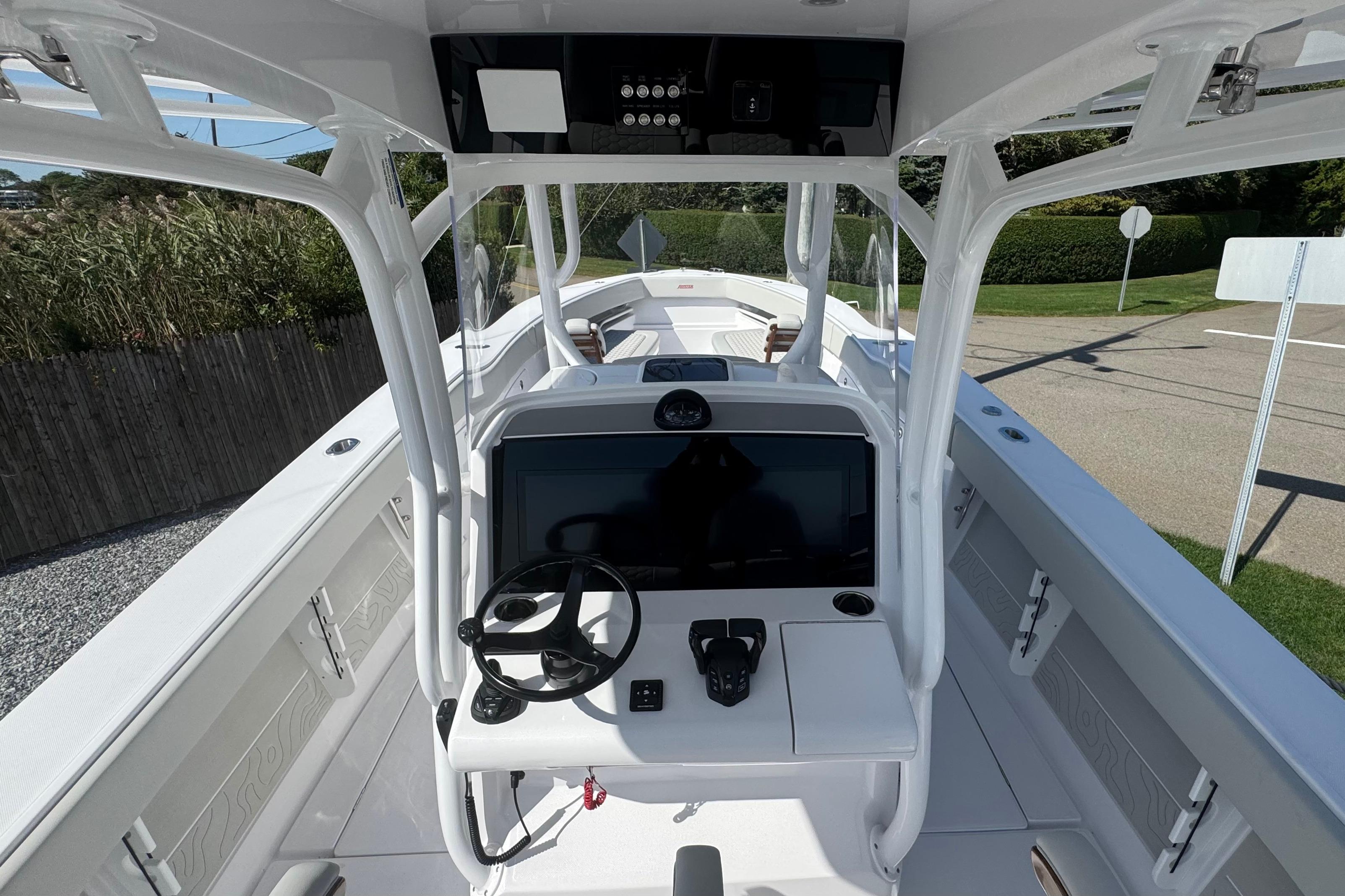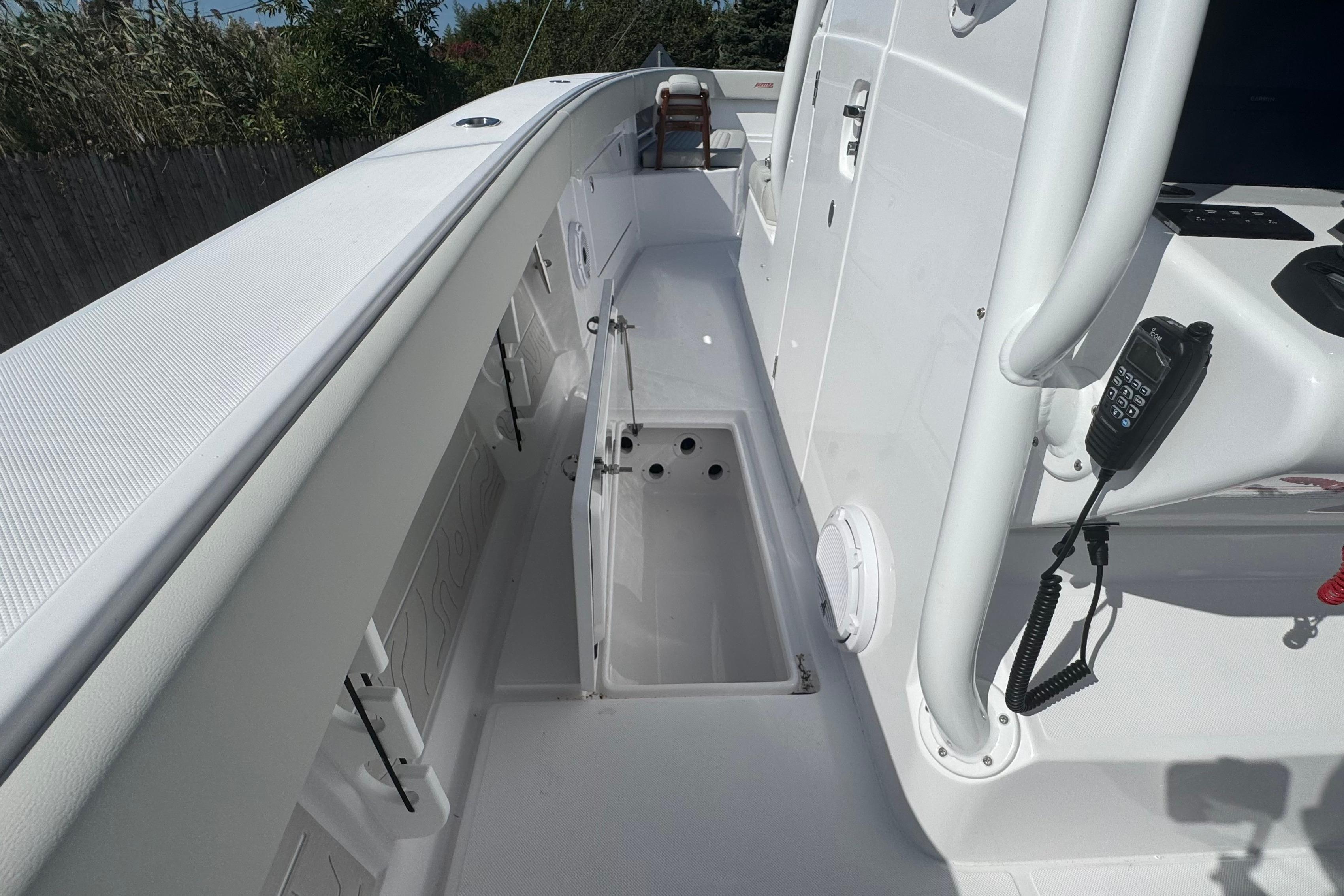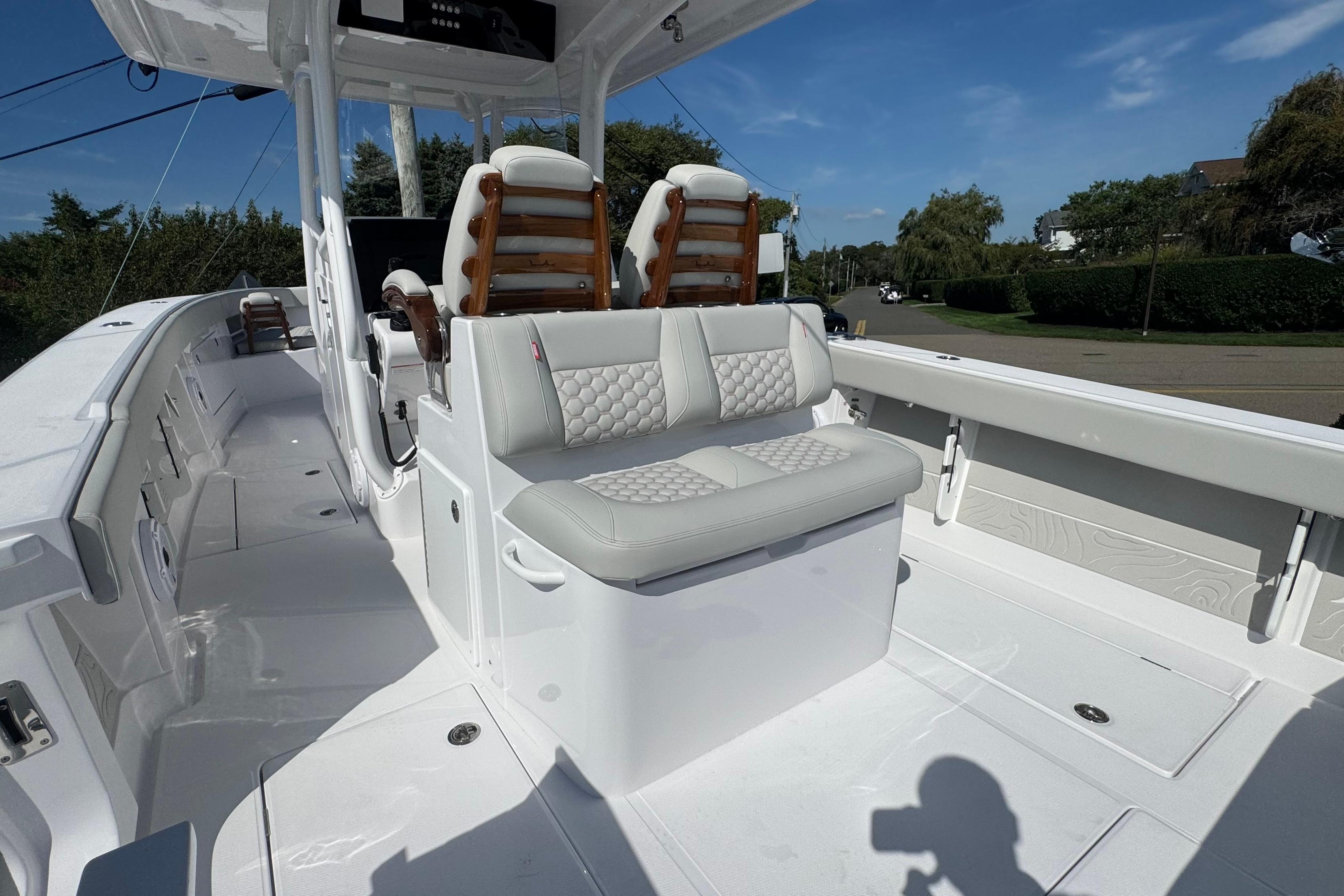 This build is powered by triple Yamaha F350s with Helm Master joystick control and autopilot, offering unmatched maneuverability and precise handling. Finished in classic white gelcoat with a red/marine gray boot stripe, this 34 HFS is outfitted with premium fishing, seating, and technology options designed for serious anglers and discerning owners.